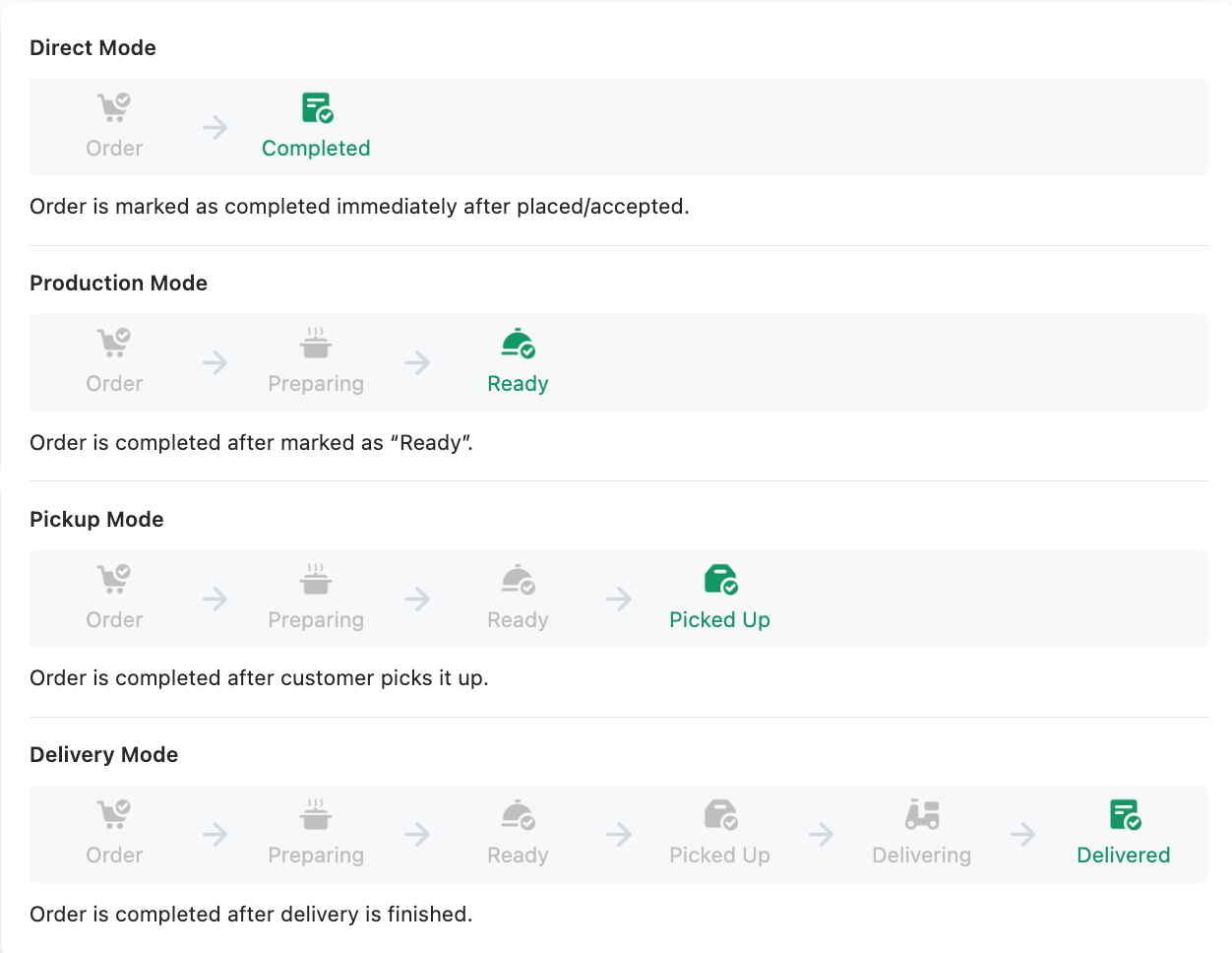 Choose from 4 order completion modes based on your business type: